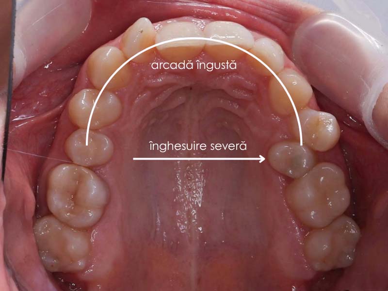 - Forma arcadei: Arcada superioară era îngustă, în formă de „V”, ceea ce limita spațiul disponibil pentru alinierea corectă a dinților.