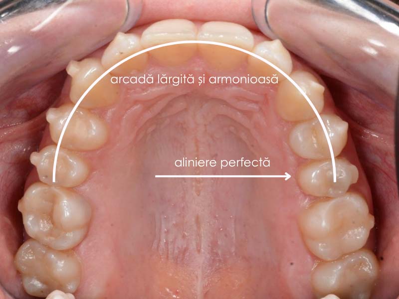 ● Aliniere Perfectă: Toți dinții sunt acum în poziția lor ideală. Premolarul care era complet în spate se încadrează perfect pe linia arcadei.