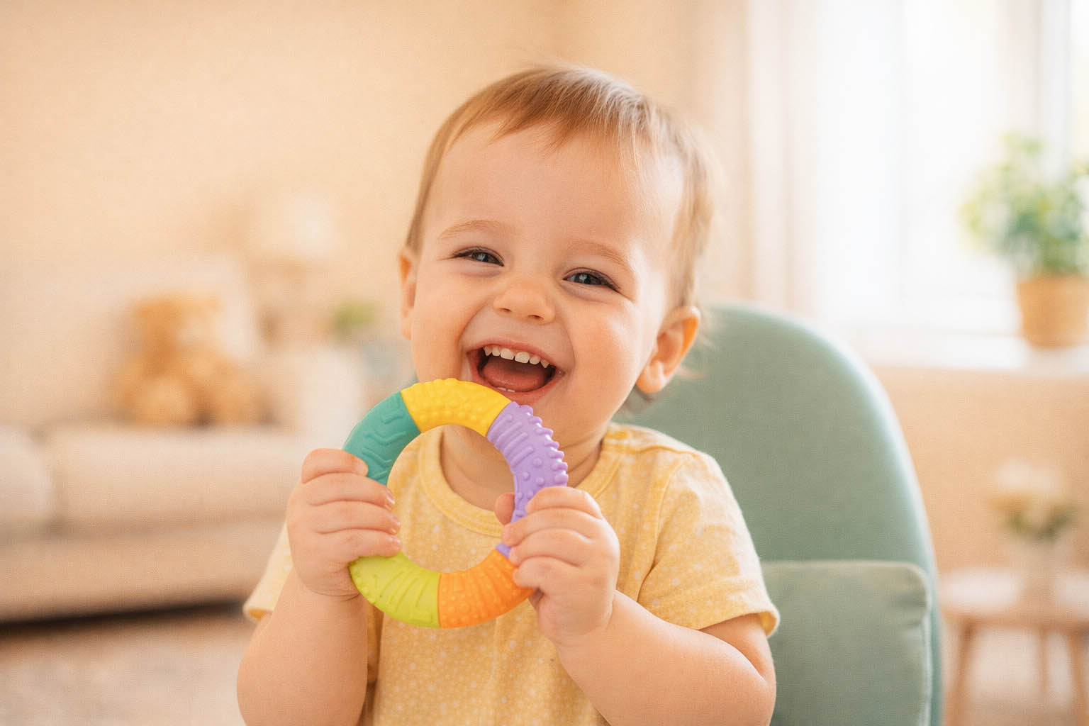 - Terapia prin Frig: Inele gingivale reci (din frigider, nu congelator) și alimente moi/reci (iaurt, piure de fructe).