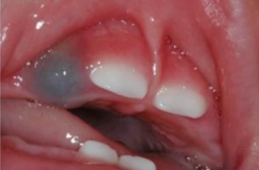 - Tatuajul de Amalgam: Colorație gri-albăstruie permanentă cauzată de particule de obturație vechi (la copii mai mari).